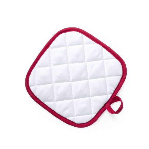 Agarrador de cocina en suave material 100% poliéster de suave acabado en color blanco y con bordes en vivos colores. Con una cara lisa especialmente diseñada para sublimación y cinta para colgar.