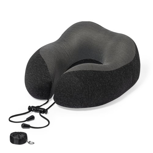 Cómoda almohadilla portátil acolchada para cuello. Máxima experiencia de confort para cualquier viaje gracias a la almohadilla de suave tacto y los cierres de cordón para un correcto y cómodo ajuste. Con funda confeccionada en RPET para protegerla en el transporte y etiqueta distintiva. El material RPET se elabora a partir de plástico reciclado, para así fomentar la reutilización de residuos plásticos y ayudar a la sostenibilidad del planeta.