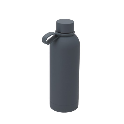 Bidón de 500 ml de capacidad, fabricado en Acero Inox con acabado engomado. Incluye asa de silicona a juego.