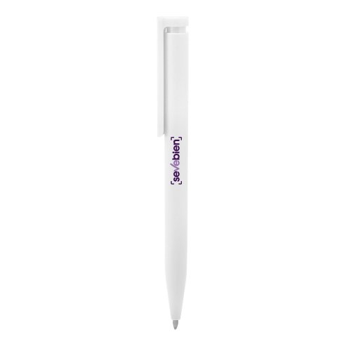 Plástico. Cuerpo de diferentes colores. Bolígrafo retráctil. Clip plástico del mismo color del cuerpo. Tinta negra. Sistema de botón push para destapar. Amplia área de impresión.