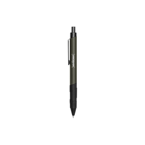 Metálico. Pulsador y puntera de plástico negro. Clip metálico en color negro. Grip de goma negro. Cuerpo de color. Tinta negra.