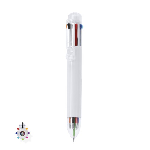 Bolígrafo con 8 variados colores de escritura en ABS. Este instrumento de escritura ofrece una variada paleta de colores en un solo bolígrafo, con una selección de 8 colores diferentes adaptándose a cualquier tarea. Su diseño ergonómico y funcionalidad hace que se pueda seleccionar fácilmente cada opción con sus pulsadores en la parte superior. Ideado con la caña de color blanco y accesorios y clip de color transparente.