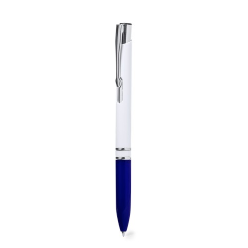 Elegante bolígrafo con mecanismo pulsador. Con cuerpo acabado en color blanco brillo y empuñadura en variada gama colores. Fabricado en resistente ABS acabado brillo. Con carga jumbo y tinta azul.