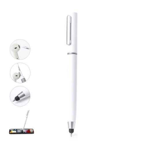 Práctico bolígrafo puntero de mecanismo giratorio, con accesorios de limpieza alojados en la parte superior de la caña. Incluye un cepillo y una punta metálica protegidos por una capucha. Con clip metálico y en tinta azul. Disponible en varios colores y presentado individualmente en caja de diseño kraft.