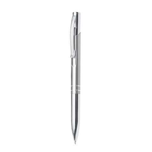Original bolígrafo de mecanismo pulsador en elegante diseño bicolor. Cuerpo troquelado en aluminio de suave acabado en variados colores. Original clip, anillas y punta en plateado. En tinta azul.