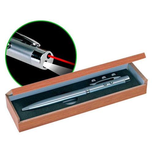 Bolígrafo metálico multi-función 3 en 1. Incluye bolígrafo, linterna LED y puntero láser. Presentación en estuche de madera.