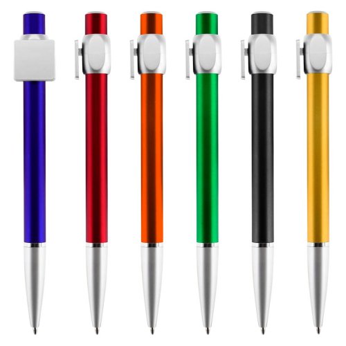 Bolígrafo "Badge" con cuerpo de color metalizado y clip cuadrado plateado, ideal para imprimir isotipos. Escritura azul.