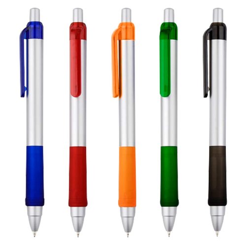 Bolígrafo plástico "Praxis" con cuerpo plateado, grip y clip de color traslúcido. Escritura azul.