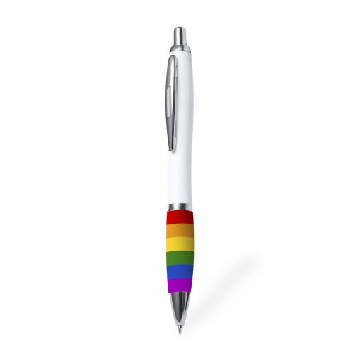 Bolígrafo Rainbow, con empuñadura multicolor y cuerpo en acabado blanco. De mecanismo pulsador, con clip metálico y accesorios cromados. Todo un orgullo de bolígrafo, en tinta azul.