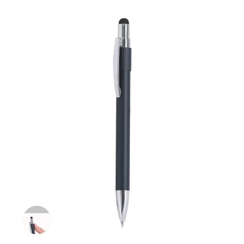 Elegante bolígrafo puntero de Aluminio Reciclado. Con mecanismo pulsador de acabado mate y puntero en la parte superior en negro, en tinta azul. Clip y accesorios en acabado cromado. Incluye sistema spinner antiestrés. Con logo de Aluminio Reciclado grabado.