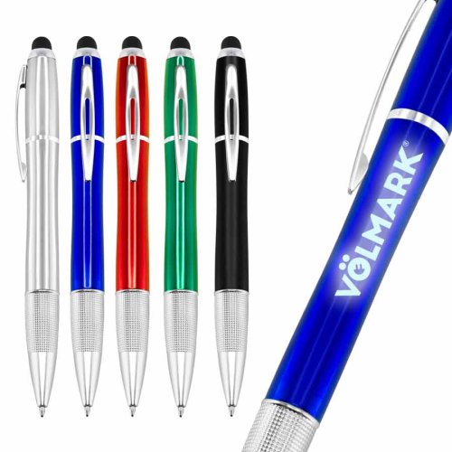 Bolígrafo plástico con puntero screen-touch al tono, modelo "NEON". Incluye luz LED al interior, para retroiluminar logo grabado sobre el cuerpo del bolígrafo. Escritura azul.