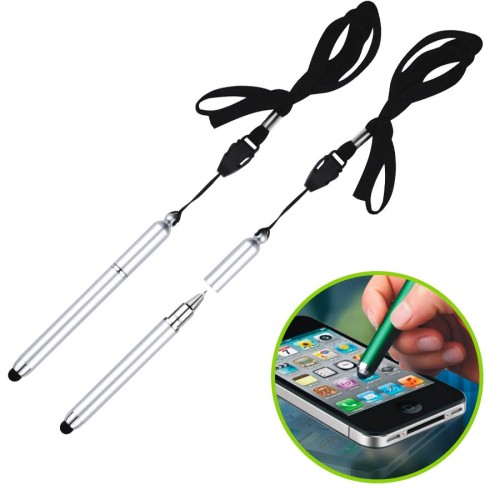 Bolígrafo "Touch-Screen" con goma posterior negra para pantalla táctil. Incluye lanyard colgante negro. Escritura azul.