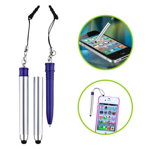Bolígrafo "Touch-Screen" con tapa plateada y goma posterior negra para pantalla táctil. Incluye práctico soporte plástico para insertar en la salida de auricular del iPhone. Escritura azul.