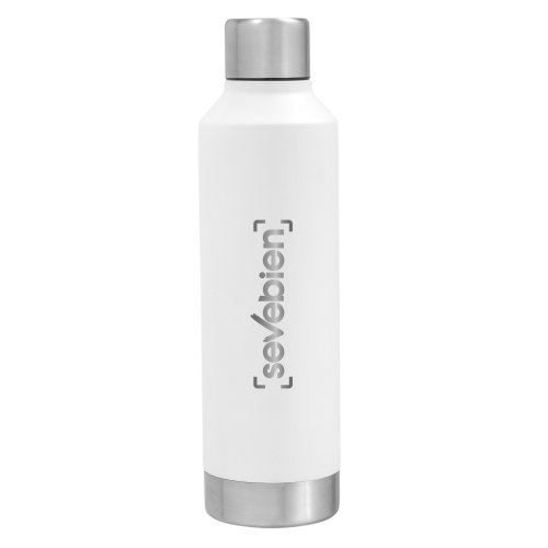Ø 7 x 25 cm. Capacidad 550 ml. Acero inoxidable. Botella doble pared, sellada al vacío. Interior en acero 304 y exterior en acero 201. Tapa de acero 201 a rosca con anillo de silicona. Pintura Powder coat (pintura más duradera y resistente a la corrosión y el paso del tiempo). Mantiene hasta 12 hs la temperatura de las bebidas calientes y 24 hs de las bebidas frías. Presentación en caja de regalo Kraft.