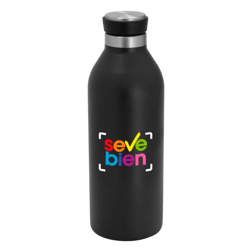 Ø 7,2 cm x 21,5 cm. Capacidad 500 ml. Acero inoxidable. Botella doble pared, sellada al vacío. Interior en acero 304 y exterior en acero 201. Pintura acabado mate. Tapa de polipropileno, acero inoxidable 201 y anillo de silicona. Mantiene por más de 12 hs la temperatura de las bebidas calientes y 24 hs de las bebidas frías. Presentación en caja de regalo kraft.