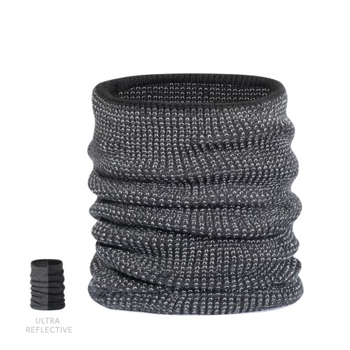 Cálida braga para cuello reflectante de punto de canalé, fabricado en material suave acrílico elástico en combinación con poliéster, e interior en suave polar fleece. Incluye un hilo reflectante entrelazado dentro del tejido para aumentar la visibilidad.