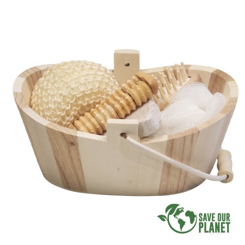 Canasto SPA de belleza en madera modelo "Naturals". Contiene cepillo de pelo, esponja malla, masajeador de madera, piedra pomez y esponja de masaje corporal.