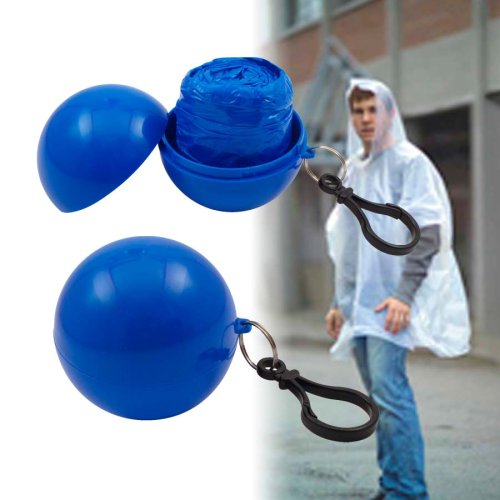 Capa de Agua (Poncho) comprimido en pelota plástica desmontable. Incluye un práctico mosquetón para colgar. Ideal para llevar adonde quieras y estar 100% preparado por si te pilla una lluvia repentina!!!