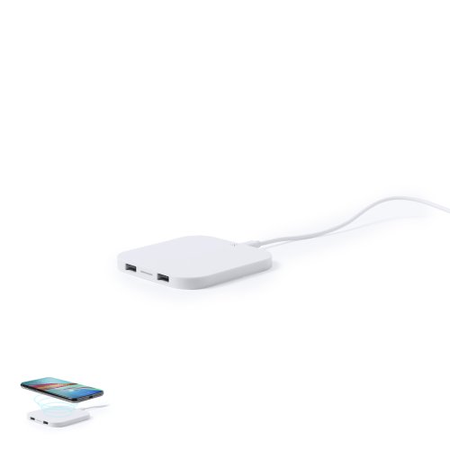 Cargador inalámbrico de diseño minimalista en color blanco. Con salida USB dual extra de 2.100 mA de capacidad para carga simultánea de dos dispositivos. Con base antideslizante. Compatible con dispositivos equipados con tecnología de carga inalámbrica y presentado en atractiva caja de diseño.