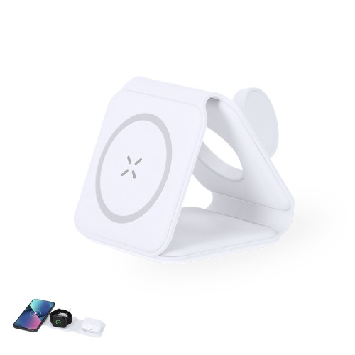 Completo cargador inalámbrico magnético 15W, diseñado para la carga simultánea del smartphone, auriculares y smartwatch. Un gadget todo en uno: plegable, portátil, de tamaño compacto, muy versátil y de diseño funcional. Conexión por usb Tipo C -cable incluido- y elaborado en resistente ABS de color blanco. Fabricado conforme a los estándares RoHS y en cumplimiento con los siguientes requisitos de seguridad:Sistema de protección contra sobrecalentamiento.Sistema de protección contra sobrecarga.Sistema de bloqueo para evitar cortocircuitos.