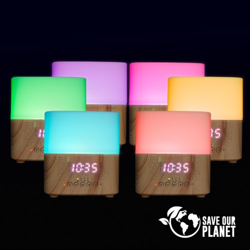 Difusor de Aroma con iluminación, reloj-alarma y parlantes. Contiene conexión Bluetooth para escuchar música desde el celular. Incluye juego de 7 luces LED rotativas de color, o bien se puede fijar cualquier color. Amplio contenido interno para líquido (hasta 300ml). Un producto para disfrutar y relajarse, que no puede faltar en tu hogar u oficina.