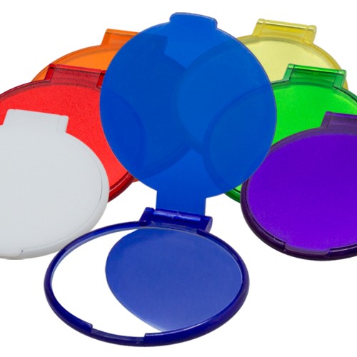 Espejo redondo de bolsillo, de plástico ABS, con tapa. Presentación individual en bolsita de polipropileno.
