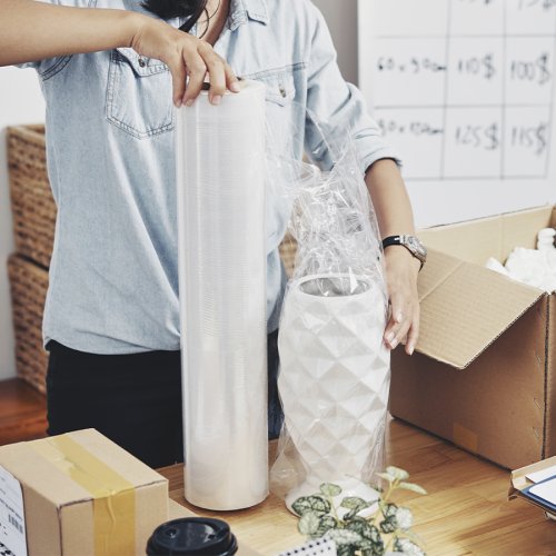 Wrapping Film Stretch para embalaje, color transparente, de 20 micrones de espesor x 500mm de grosor x 120m de largo.