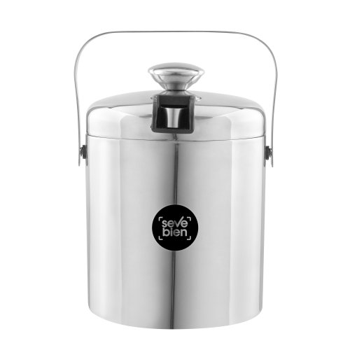 Ø 14 x 14 cm. Capacidad 1100 ml. Acero inoxidable. Interior en acero 304 y exterior en acero 201. Hielera de mesa con tapa. Pinza para hielo de acero inoxidable, encastrable en la misma tapa. Asa de acero inoxidable para transportar. Presentación en caja de regalo kraft.