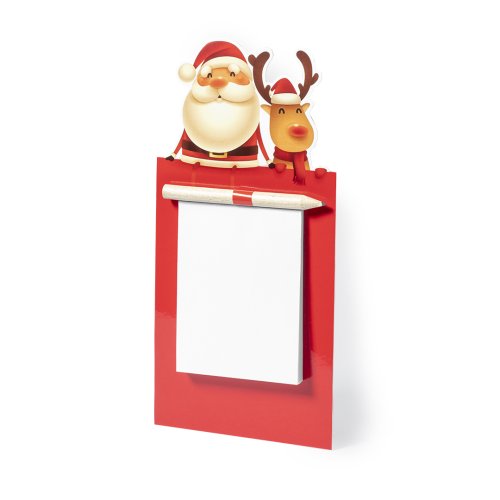 Imán con bloc de notas en divertido diseño navideño de Papá Noel y Reno. Incluye 40 hojas lisas y lápiz de madera natural.