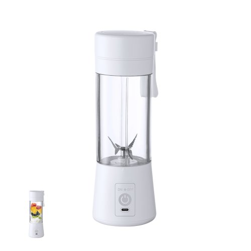 Licuadora fabricada en resistente material ABS de acabado blanco. De 380ml de capacidad y 150W de potencia, con limpiador y pinza incluidos. Batería de 2.000 mAh de capacidad, con conexión Tipo C (cable incluido). Presentada en caja individual de diseño kraft, con manual de instrucciones en español e inglés.