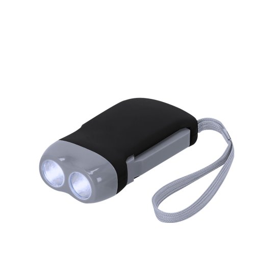 Linterna eco-amigable con 2 LEDs de carga manual mediante la dinamo incorporada; simplemente apretando el gatillo con una mano se genera energía, ofreciendo una fuente de luz sin generar residuos. En elegante color negro y gris, incluyeendo una cinta de transporte para mayor comodidad. Presentada en caja de diseño kraft.