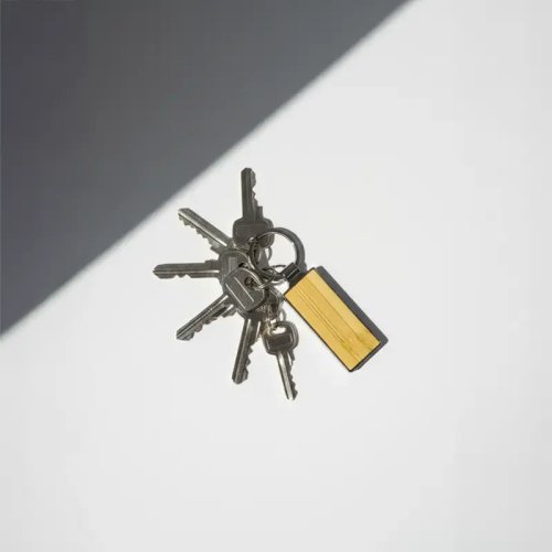 Llavero metálico con cara de bambú. Fabricado en aleación de zinc y bambú en color natural. Cuenta con anilla duradera y diseño alargado minimalista. Es ideal para merchandising ecológico, campañas publicitarias y uso diario.