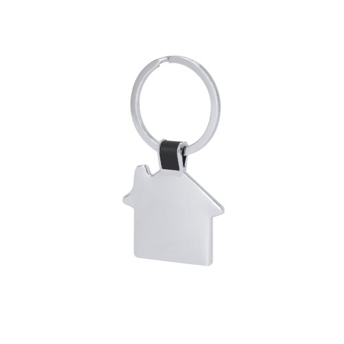 Llavero metálico co diseño de casa y detalle en color negro.