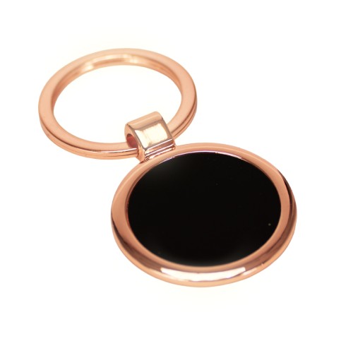 Llavero metálico redondo de zinc alloy encobrizado, con placa interior de aluminio negro. Presentación en elegante estuche laminado negro mate, con cuna aterciopelada negra.