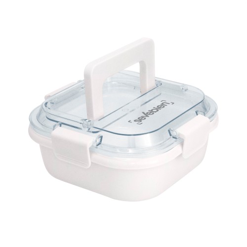 17,8 x 17,8 x 7,6 cm. Capacidad 1 litro. Plástico Polipropileno. Contenedor de alimentos. Tapa translúcida con cuatro clips de cierre hermético y asa para trasladar cómodamente. Clips y asa del mismo color que el recipiente.