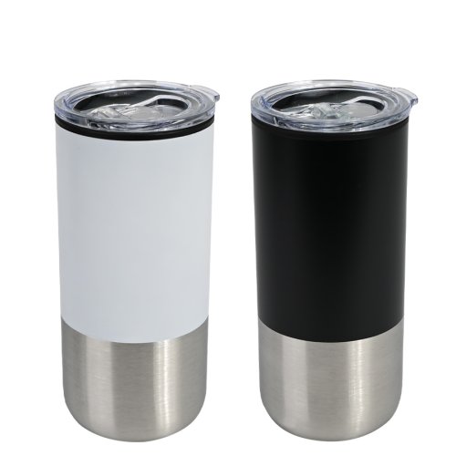 Mug metálico bicolor doble pared aislante, interior plástico PP, exterior plástico PP con pintura POWDER COAT, combinado con Acero inoxidable 201 SS, modelo "THEO". Producto BPA FREE, para el contacto con líquidos y alimentos. Fondo de silicona negra ABS anti-deslizante. Tapa removible de plástico PS Crystal Clear con sello cilíndrico de silicona. Capacidad 450ml. Presentación en bolsa PP + caja de regalo de cartón negro.