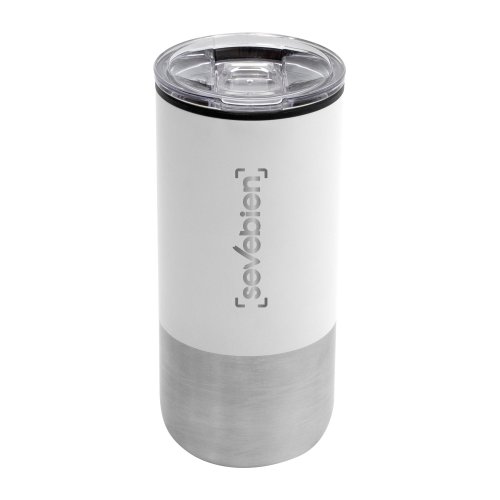 Ø 8 cm X 17.6 cm. Capacidad 500 ml. Polipropileno y acero inoxidable. Mug doble pared. Interior en plástico y exterior de acero inoxidable 201. Tapa plástica transparente a presión con anillo de silicona. Base antideslizante. Presentación en caja de regalo.