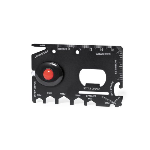 Práctica multiherramienta fabricada en acero inox y acabado en negro. Diseño plano en forma de tarjeta y con 16 funciones: destornilladores planos, abridor de cartas, regla en cm y pulgadas, abridor de botellas, abrelatas, pelador, llave para tuercas hexagonales en varios tamaños y linterna (pila de botón incluida). Presentada en bolsa individual diseño en papel reciclado.