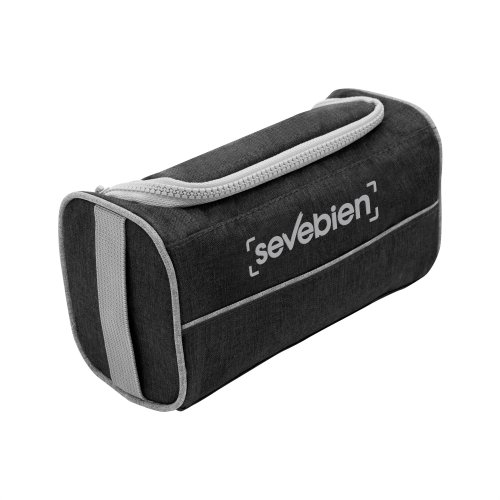 22 x 10 x 12 cm. Poliéster 300D bicolor. Necessaire con tapa. Organizador con dos bolsillos internos de red elastizados, tapa acolchada con cierre plástico color gris y asa lateral de tela color gris para transportar.