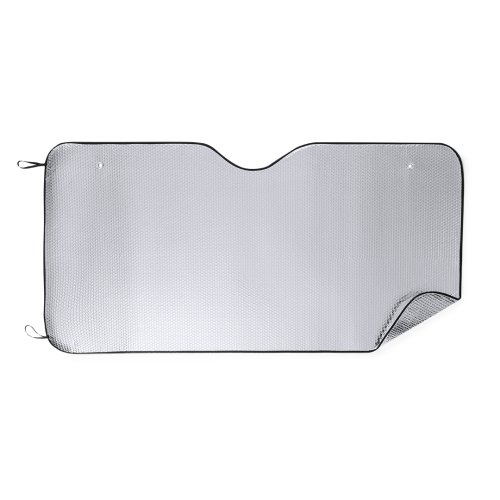 Parasol en aluminio con burbuja en ambas caras en color plateado de acabado metalizado con ribetes en color negro. De tamaño maxi 180x90cm, con argollas metálicas de refuerzo, cintas elásticas para plegado, dos ventosas para ajuste en luna y presentación desplegado en plancha para fácil impresión.