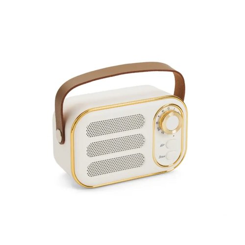 Parlante vintage blanco con correa. Hecho de plástico ABS y cuero PU. Cuenta con correa superior, perilla frontal, botones de control, conexión USB-C, radio FM (87.5–108 MHz), y compatibilidad con Bluetooth, tarjeta TF, USB y entrada AUX. Es ideal para ambientar espacios con estilo retro mientras disfrutás de tu música favorita.