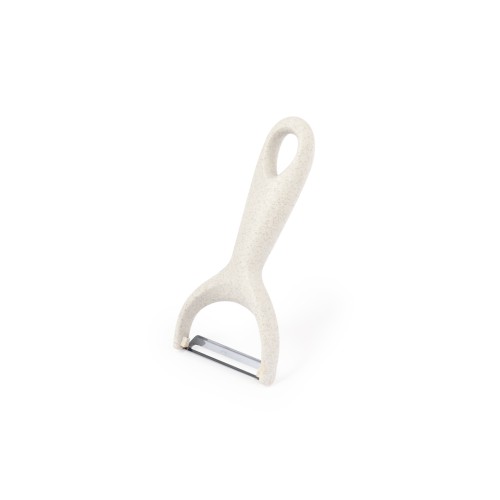 Práctico pelador de mano fabricado en pp. Con mango ergonómico para un fácil agarre y agujero para colgar. Presentado en bolsa de papel reciclado.