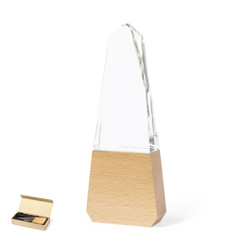 Placa conmemorativa fabricada en cristal grueso y resistente, con base en madera natural. Presentada en estuche de protección kraft, con cierre magnético y espuma interior.