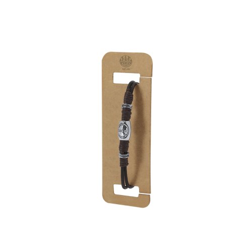Pulsera de piel marrón adornada con cordones de algodón encerados a juego y abalorios plateados, incluyendo un charm con el símbolo de la paz. Cuenta con un original cierre de aleación de zinc en tono plateado. Presentada en cartón kraft con superficie lisa para el marcaje.