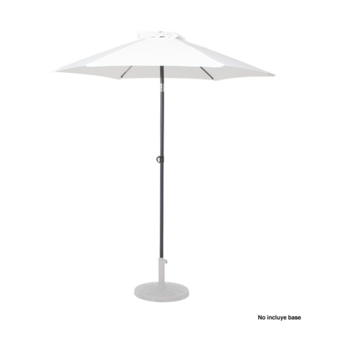 Quitasol redondo de Ø2m, modelo "Twist", con 6 cascos de lona Poliéster UV impermeable de 160g. Contiene varas reforzadas de Acero recubierto de 12 x 18mm, asta de Acero recubierto de 32mm, sistema de apertura manual y codo giratorio de 45°. No incluye base.