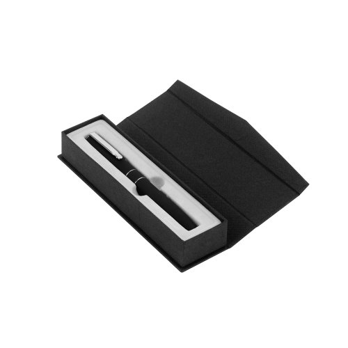 Metal. Cuerpo metálico engomado. Clip y detalles color plata. Tinta gel negro. Decape electroplateado en la parte superior. Estuche con cierre magnético. Área de impresión: Ø 0,8 x 5 cm. Presentación en estuche con cierre magnético.