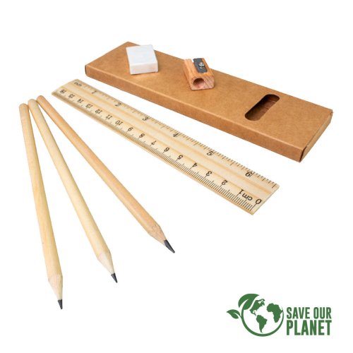 Set Escolar Ecológico. Incluye 3 lápices grafito negro largos de madera + 1 regla de 16.5 cm. de madera + 1 sacapuntas de madera + 1 goma de borrar. Presentación en Estuche ecológico de cartón reciclado.