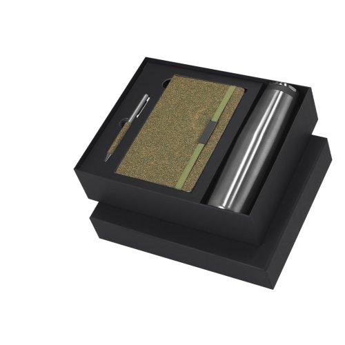 Set de bloc de notas y bolígrafo confeccionados con Fibra de Té, además de un bidón térmico fabricado en acero inox.El set incluye:- Bloc de notas de tapas rígidas, con 80 páginas rayas, banda elástica con clip metálico y marcapáginas a juego. - Bolígrafo de aluminio en acabado cromado con empuñadura de Fibra de Té, mecanismo giratorio y tinta azul. - Bidón térmico de doble pared fabricado en acero inox de 500ml. Con tapón a rosca y asa metálica. Bloc con logo Tea Grounds marcado en la parte posterior. Presentado de manera elegante en una caja negra con interior troquelado. Tea Grounds es un material sostenible creado a partir de residuos de hojas de té recicladas. Durante el procesamiento del té, se recolectan y compactan los restos para darles una segunda vida como recurso útil. Su producción fomenta la economía circular y reduce el impacto ambiental.
