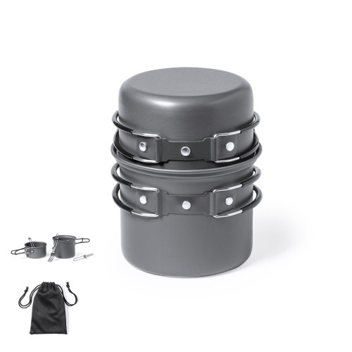 Completo set de menaje para camping de tamaño ultra compacto. Presentado en resistente funda de RPET con cierre de cordón, accesorio de ajuste y etiqueta exterior con distintivo RPET. Contenido:1 olla de aluminio acabado gris mate. 800 ml de capacidad 13 cm de diámetro x 10 cm de alto. Asas plegables con protección antiquemaduras.1 olla de aluminio acabado gris mate. 600 ml de capacidad 12 cm de diámetro x 6,5 cm de alto. Asas plegables con protección antiquemaduras.Cuchara, cuchillo y tenedor plegables fabricados en acero inox. Con mango troquelado y cierres de seguridad. Presentados en funda individual de RPET con cordones de cierre. El material RPET de las fundas se elabora a partir de plástico reciclado, para así fomentar la reutilización de residuos plásticos y ayudar a la sostenibilidad del planeta.