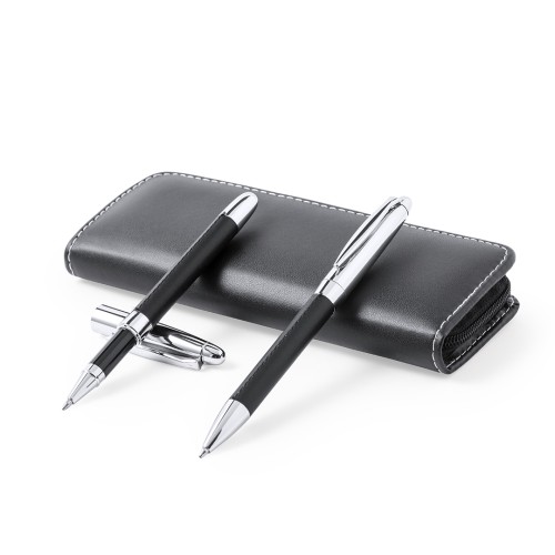 Set premium de bolígrafo y roller. Fabricado en elegante combinación de polipiel en tonos negros y metal cromado. Bolígrafo de mecanismo giratorio en tinta azul y con cartucho jumbo. Roller con capucha y tinta gel en azul, carga jumbo. Presentado en estuche individual de polipiel con cierre de cremallera e interior a juego con compartimentos individuales.